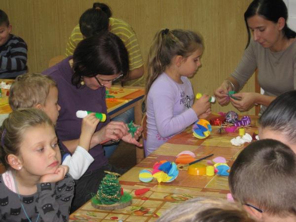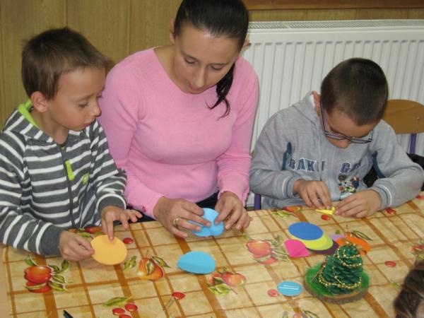 Rodzice wspólnie z dziećmi poznali różnorodne techniki wykonania ozdób choinkowych.