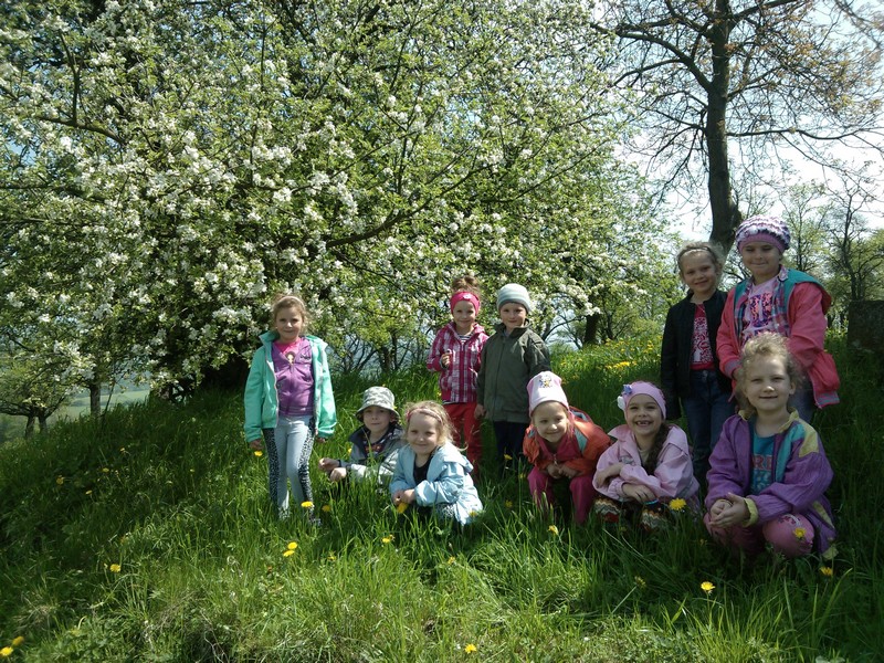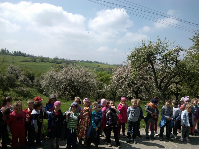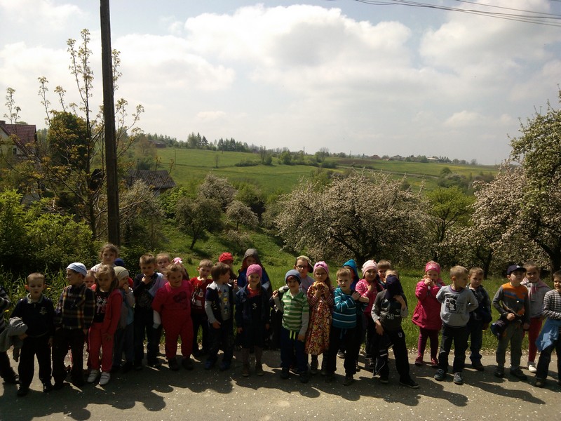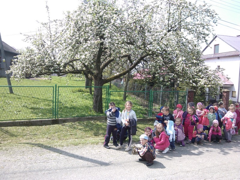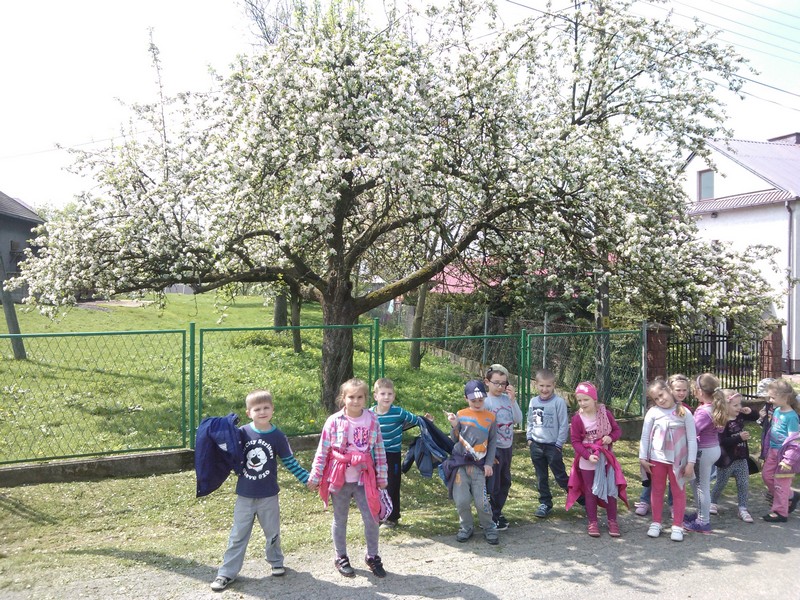 W słoneczny, kwietniowy dzień, przedszkolaki wybrały się na wycieczkę do sadu.