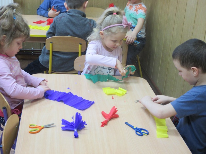 Dzieci pod opieką wychowawców zrobiły barwne kwiaty z bibuły.