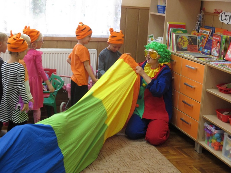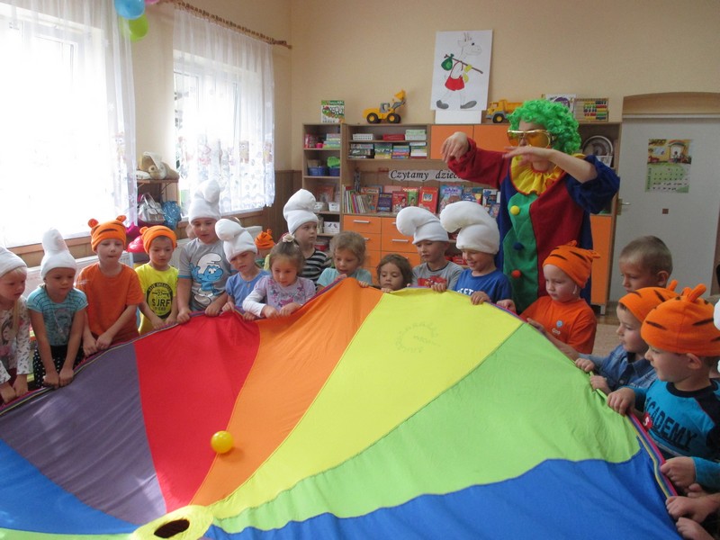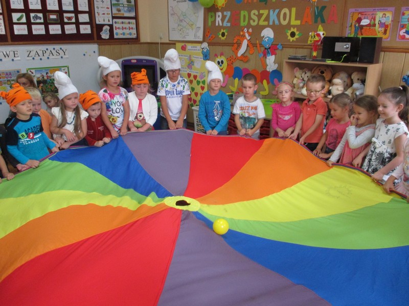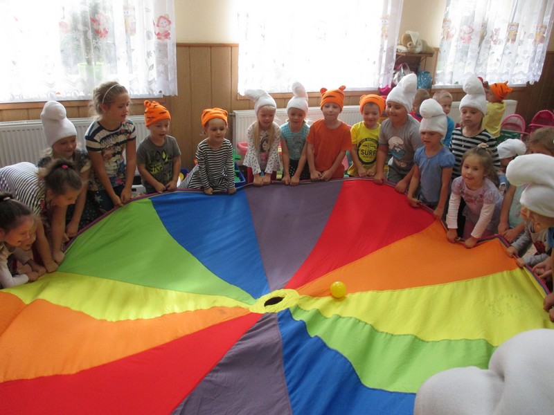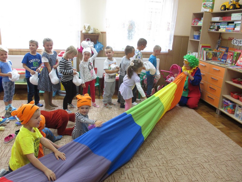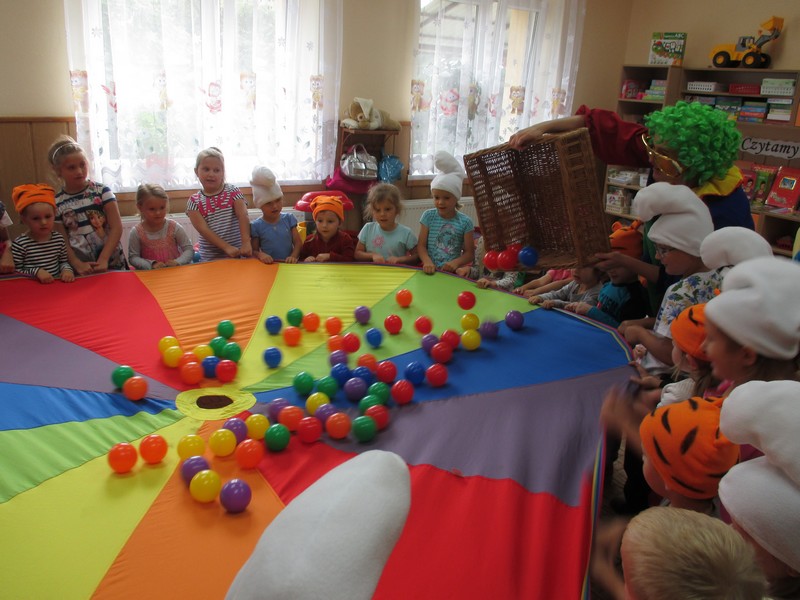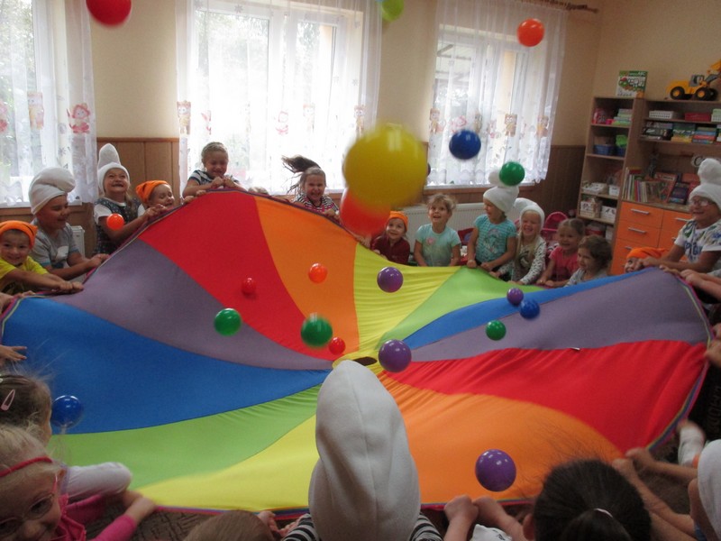 z wykorzystaniem chusty animacyjnej, piłeczek, tęczowego tunelu,