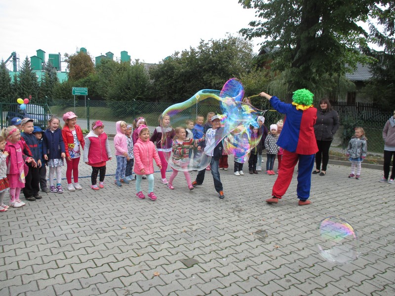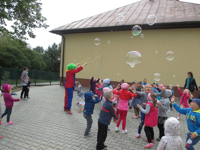 Na podwórku odbył się bajeczny pokaz baniek mydlanych.